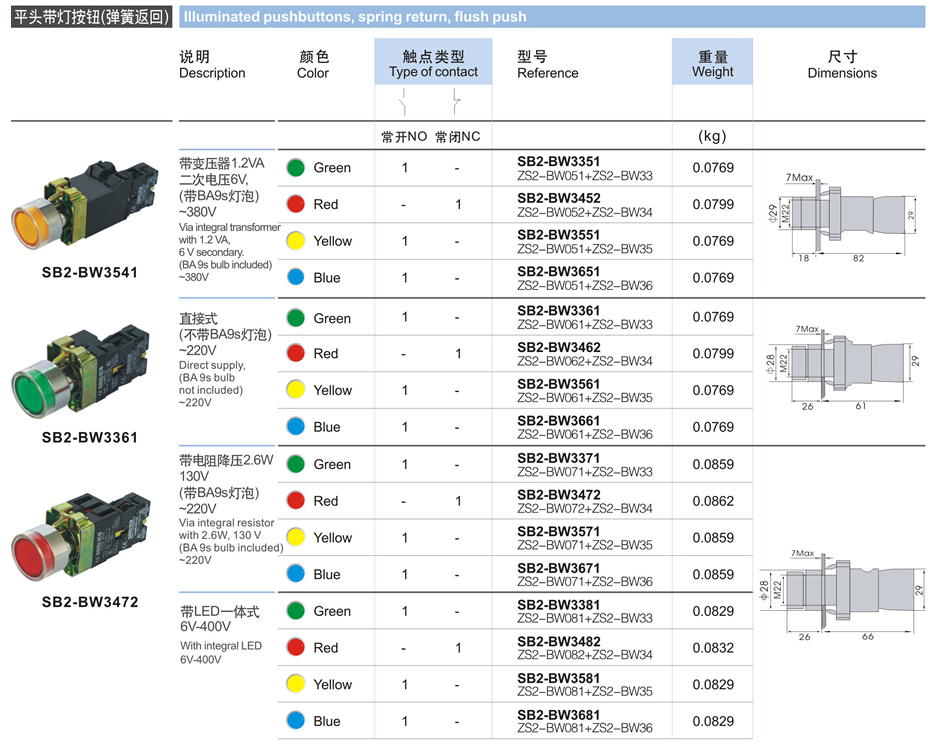 平頭帶燈按鈕(彈簧返回)